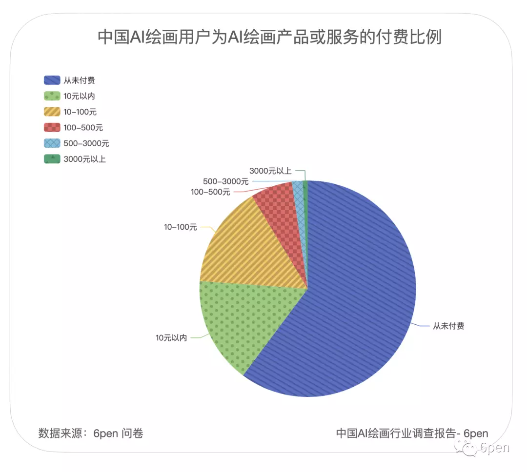但是国内愿意为AI绘画付费的用户比例有限,6pen的《报告》显示,60%的用户并没有在使用AI绘图产品上有过付费行为,16%付费在10元以内,14%在100元以内,付费超过100元的不到10%。