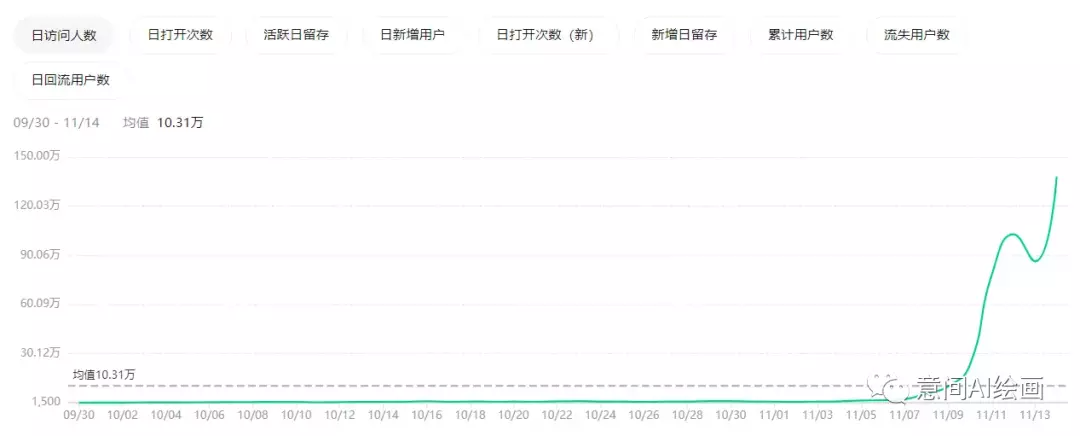 其中,意间AI绘画微信小程序排队人数一度高达8万人,其团队在官方公众号公布了用户数据,小程序自2022年9月30日上线,截至11月12日,注册用户数由0增长到117万,3天后,11月15日,这个数字突破了300万。