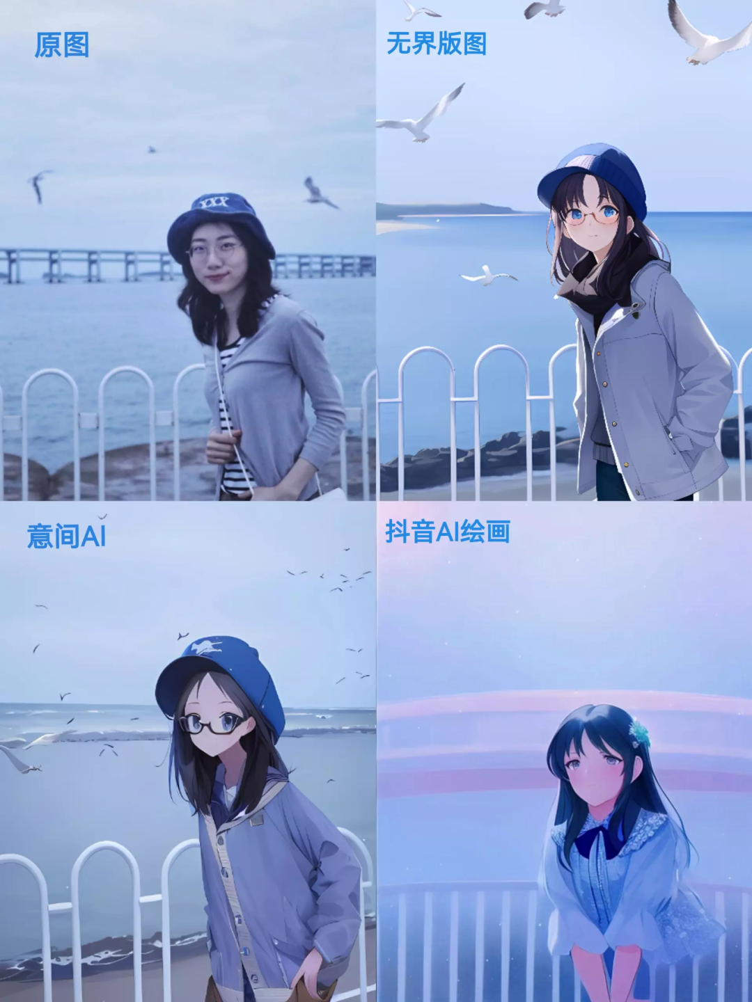 我们分别以无界版图、意间AI、抖音AI绘画为例,均使用相同关键词:年轻女生,蓝色帽子,细框眼镜,侧身站在海边,天空中有飞翔的海鸥,二次元,丰富细节,最后出现了3张效果不同的AI绘画图。