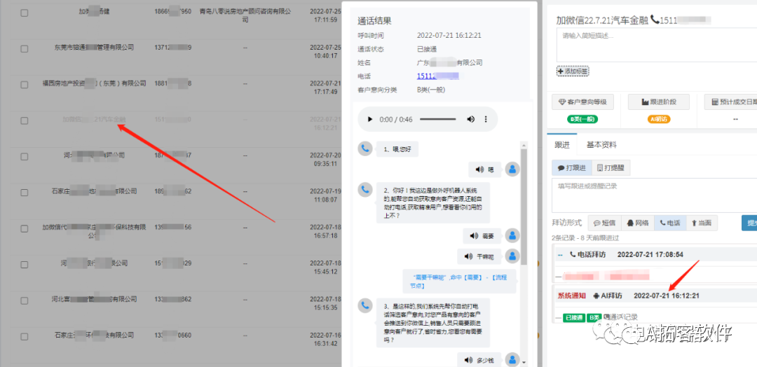 使用智能ai语音电话机器人,自动拨打电话,真人录制话术语音,直接和客户对话,和我们人员打电话销售一样,整个过程中,通顺流畅。且打出来的客户,会根据客户回复分类A