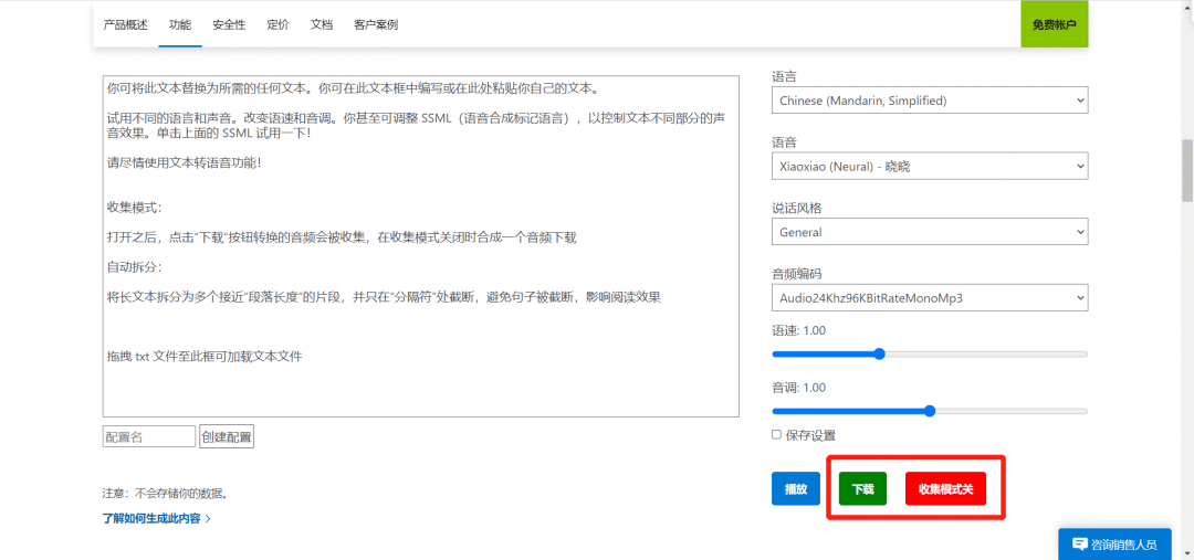安装好脚本后,再回到微软的文本转语音页面,刷新页面就会出现下载、收集模式按钮,点击下载就可以免费获取生成语音内容。