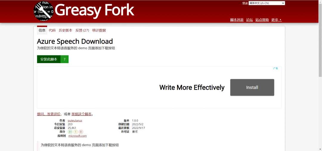然后打开下载油猴插件脚本 Azure Speech Download 页面,点击安装按钮,将脚本安装。