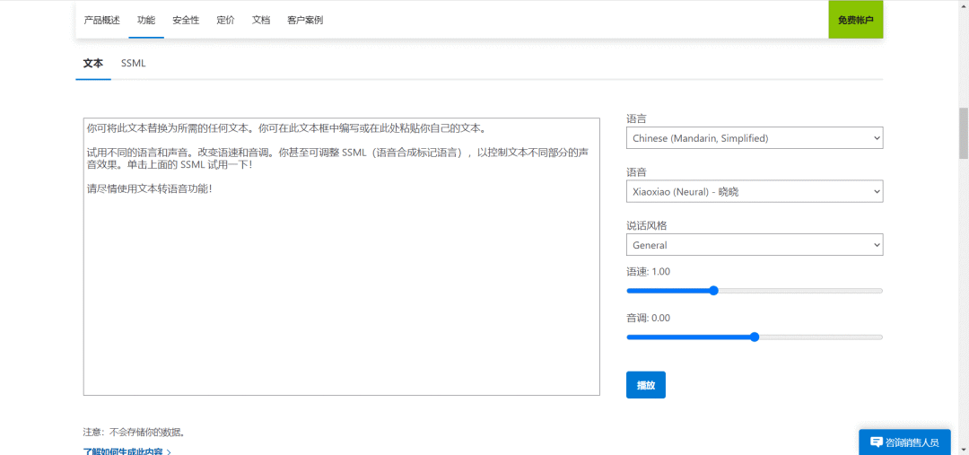 文字转语音功能界面简洁,左侧是输入需要转语音的文本,右侧是选择语言、语音、说话风格、语速、音调,整体操作简单。