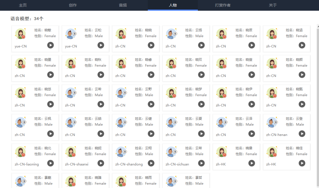 软件内置了有34个语音模型,都是可以自由免费使用,都是没有任何限制,使用前可以试听下再选择。