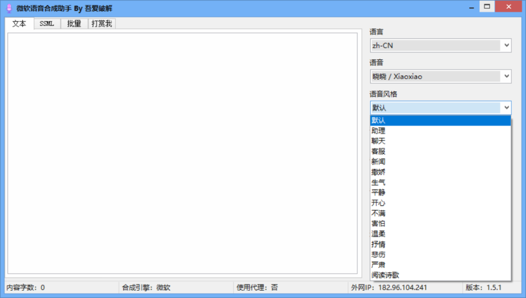 在软件的右侧,我们可以看到软件支持选择语言类型、语音人物、语音风格以及语速、语调、音量等参数设置。