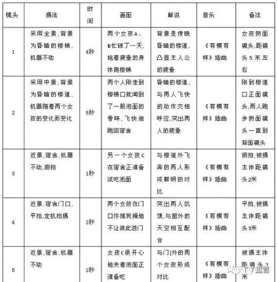 分镜头脚本是目前为止,各类短视频平台中用的比较多的一种脚本形式。这种脚本创作的关键点的关键词是——细致。分镜头脚本对画面的要求极高,因为我们要在极短的时间展现出一个情节性强的内容,所以创作起来耗时耗力。抖爆爆整理了一份康师傅方便面广告,展示品牌分镜头的脚本范本,我们可以一起来看一下:康师傅方便面广告分镜头脚本
