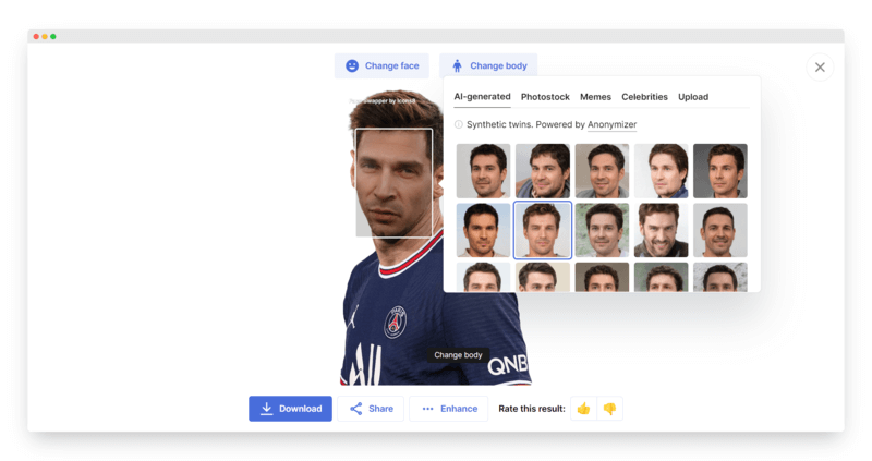 你可以单击上传你的照片或者拖拽,支持 JPG 和 PNG 格式,图片体积大小不要超过 5Mb,上传后自动识别到面孔位置,你可以选择五种更换面孔方式,分别是 AI 智能生成的面孔、图片库、明星、模因、上传,你也可以直接应用模板库的人物进行换脸,换脸完成直接下载,真的非常有趣的换脸工具,分享给你的小伙伴吧。