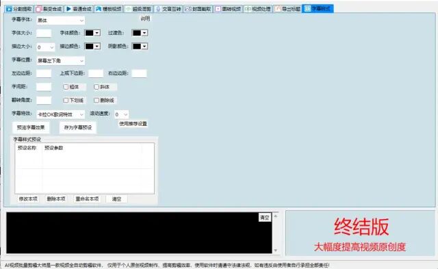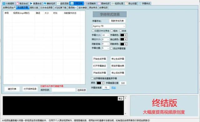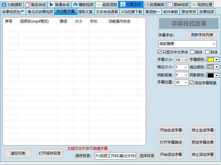 2:自动配字幕,只需批量导入视频,如果视频中存在人声则自动给视频添加字幕(支持自由设计字幕位置),支持卡拉OK风格(说到哪个字哪个字有特效),同时还支持字幕字体设置、字体大小、阴影、背景颜色等。