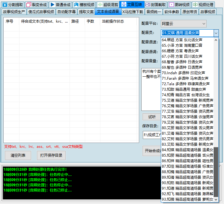 1:文本配音,支持阿里云、腾讯云两个语音API接口,其中阿里云93个各种场景配音员,同时支持语速、语调设置。