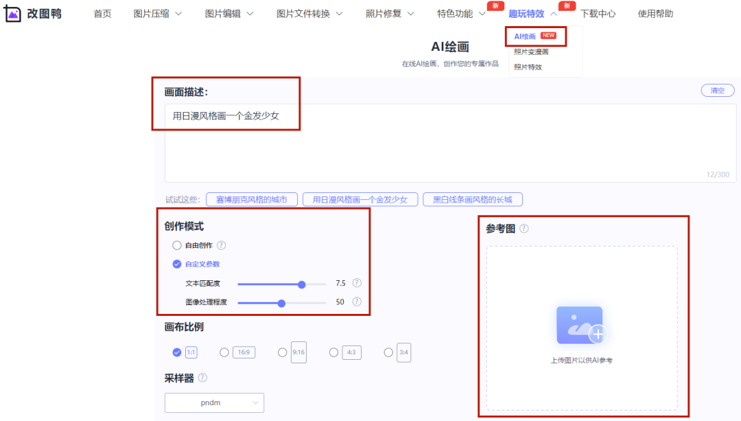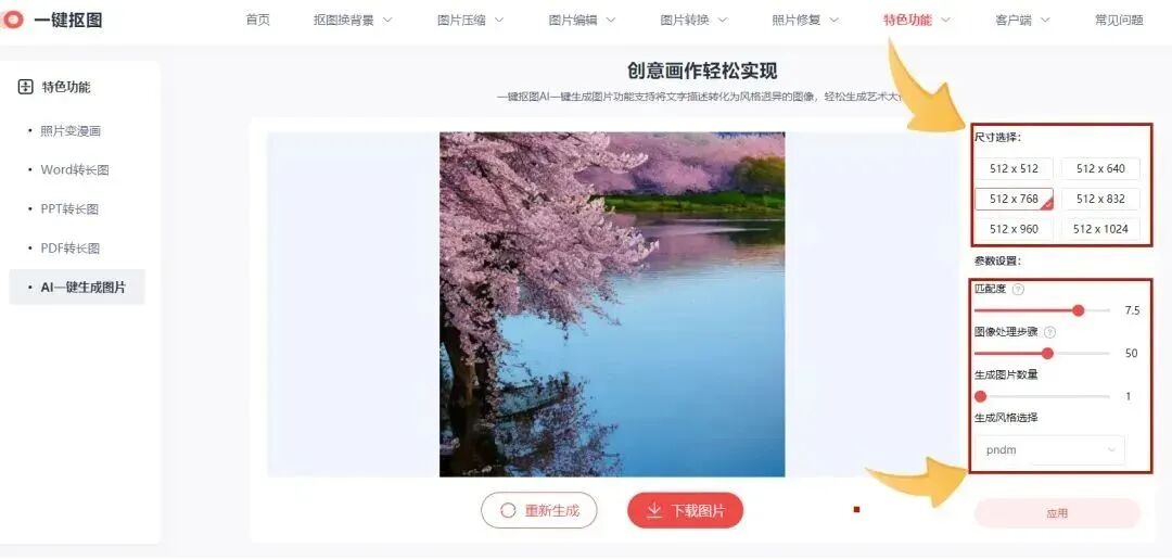 这里我们可以对图片的尺寸进行选择,甚至是文字和图片的匹配度,图像处理步骤(这个越高匹配度越高,相应的所需时间也越长),生成图片的数量。