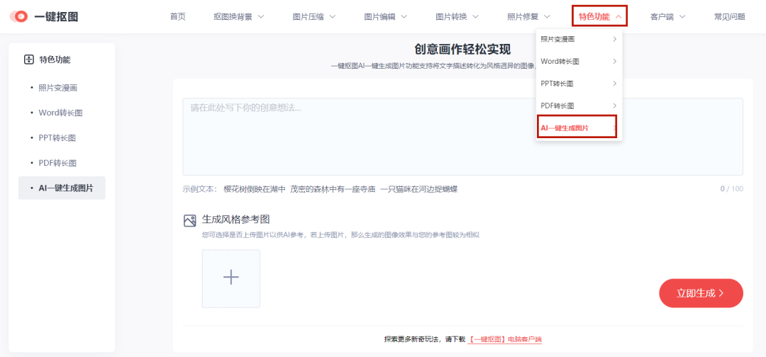不仅如此,它还有图片压缩工具、图片转换工具、AI一键生成图片等多种工具。这其中的AI一键生成图片工具,可以帮助我们将文字转成图片。