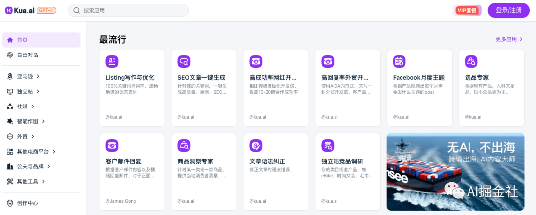 Kuai.ai主要是针对外贸出海企业开发的运营工具,包括:海外电商运营、SEO、社交媒体运营、建站套装、智能作图等等。