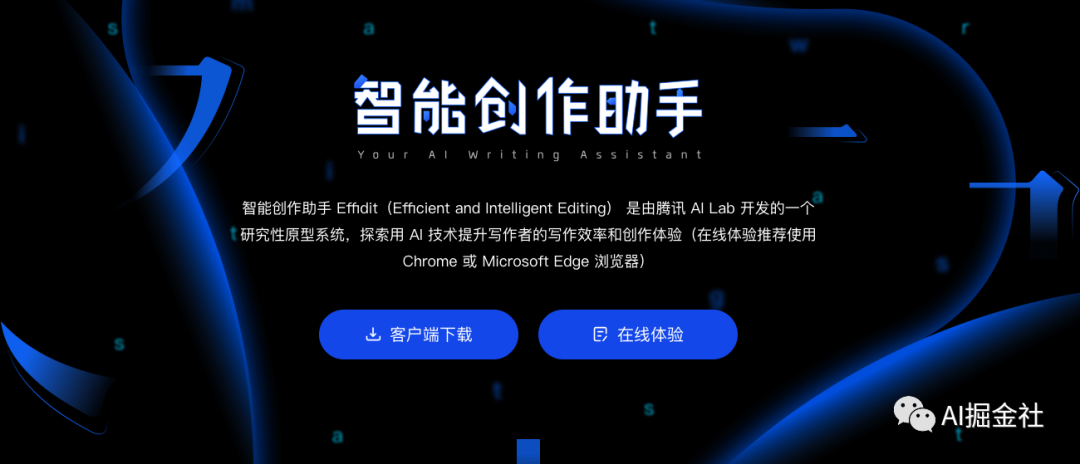 腾讯 AI Lab 研发的智能创作助手支持通用版和学术版两个版本,智能创作助手提供智能纠错、文本补全、文本改写、文本扩写、词语推荐、句子推荐与生成等功能,帮助您轻松完成中英文写作,提高写作效率