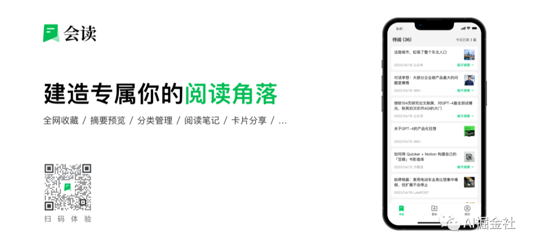 这一款渐进式阅读工具,将提供:全网内容收藏、摘要预览、待阅清单、分类管理、阅读笔记、卡片分享等功能。其中最简单的功能即:将长文转发给「会读」微信助手,微信助手会给出总结,比较方便地长文阅读提炼要点问题。