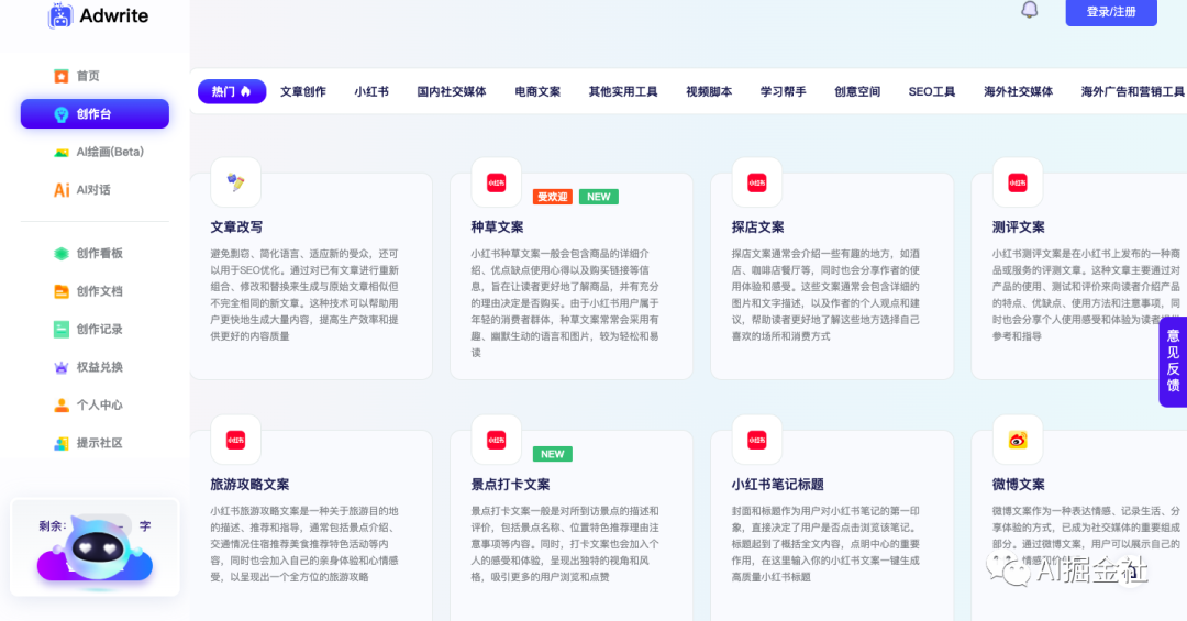 Adwrite是一款AIGC营销广告文案写作工具,覆盖的内容非常广泛,包括:文章创作、国内社交媒体、电商文案、视频脚本、SEO工具、海外广告和营销工具。类似国外网站easy-peasy.ai。