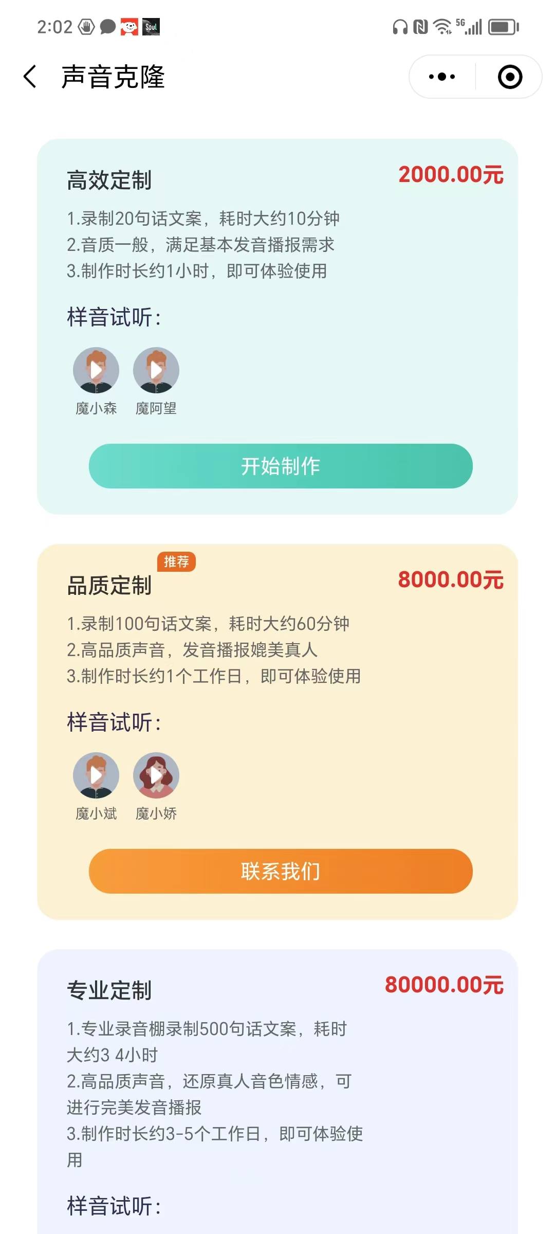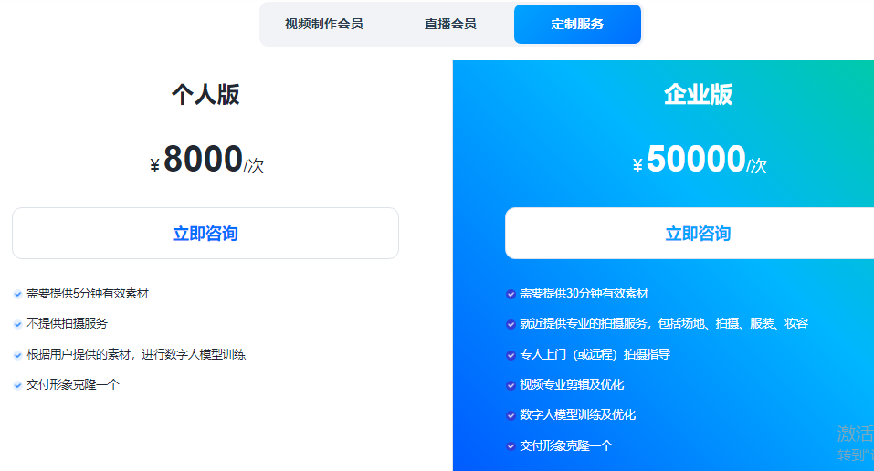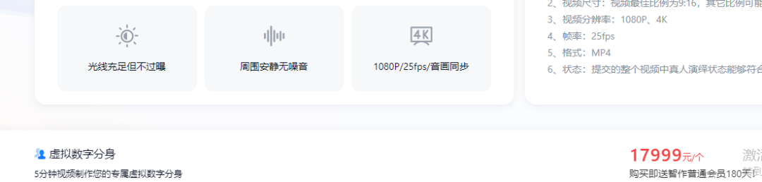 下面列举几个市面上出现的数字人价格,基本上2000元起步,大厂价格更高。针对数字人的整体产品,有专门做声音订制,也有专门做视频合成,使用平台内置的音频模板或用户额外提供音频。