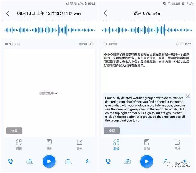 点击【导入音频识别】,你可以导入你的音频文件来进行识别,识别出来会直接显示转换后的文字,同样还是可以进行【复制】【翻译】等操作的。