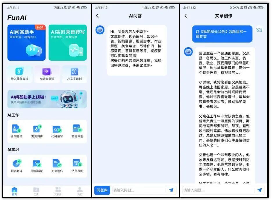 Fun AI还提供了多种主题和风格选项,让你根据需要定制生成的文章。例如你在AI问答聊天页面输入:以《我的局长父亲》为题目写一篇作文,等待你秒就能得到一篇完成的文章。