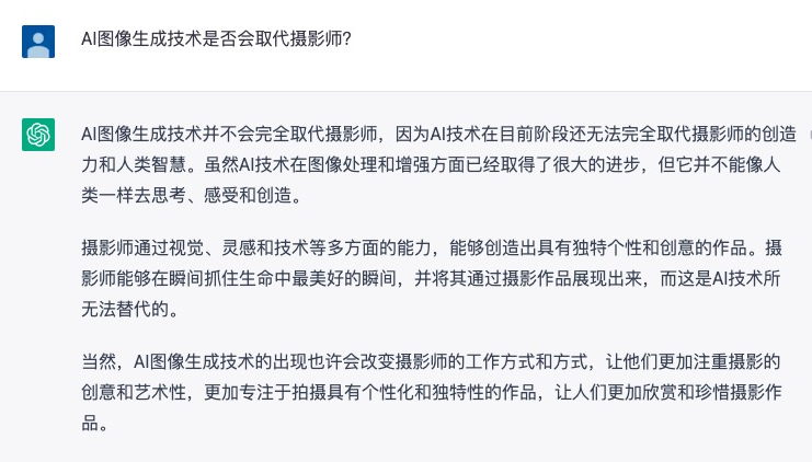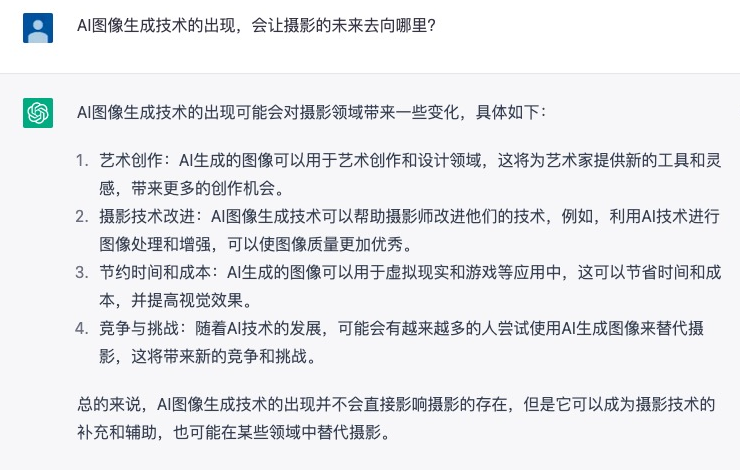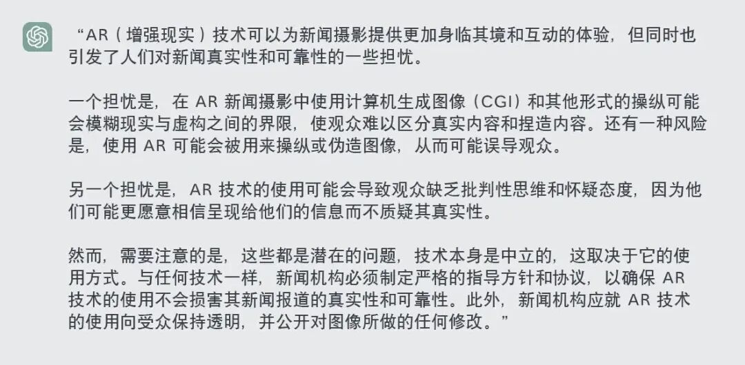 一个多月前,我注册了ChatGPT的会员,那个时候还没有Midjourney这个产品,所以我当时的提问是关于AR设备未来在新闻摄影中应用的一些问题,最后我们讨论到新闻真实性和安全性的相关的话题,它是这样回答的: