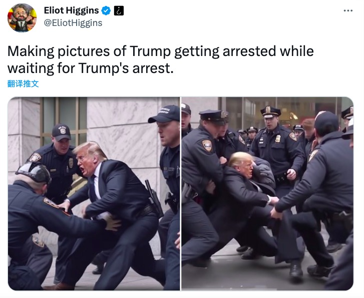 前段时间AI生成的特朗普套图,就是从被捕、庭审、收监、越狱,再到出来自由领导人民的那套图,挺像摄影在现场一样。我相信生产这样一套照片对于现在的AI模型来说应该不会太难,虽然细节还有很多可以修改的地方。
