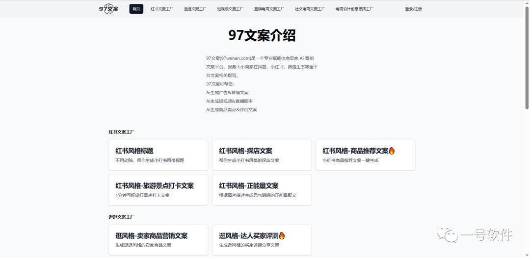 97文案,一家专业赋能电商Ai智能文案工具平台,服务中小商家在抖音、小红书、微信生态等全平台文案撰写,可帮你用 Ai生成广告文案、Ai生成短视频脚本、Ai生成商品卖点等等,使用不用注册登陆,不过免费用户有一定的使用额度。