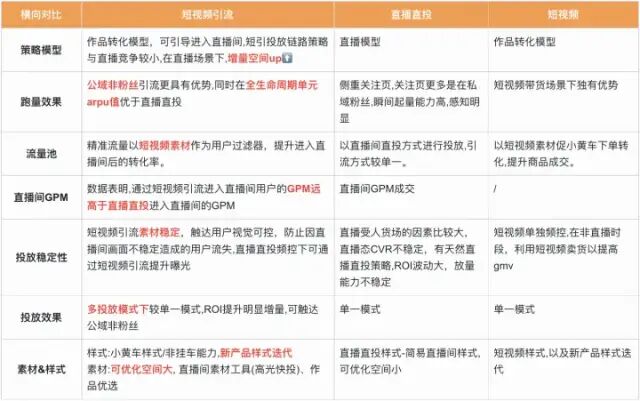 1、投放引流的三大优势第一大优势:公域非粉跑量更快,短视频引流的跑量明显高于直播直投,从数据上看短引的单元ARPU值是直播直投的2.4倍。第二大优势:拉新客效率更高。短视频引流对比直播直投GMV构成中新客占比更高,可以辅助商家不断拉新,长效经营。第三大优势:公域非粉转化效率更高:对于品牌侧短视频引流的GPM略高于直投(+15.7%),ROI略低于直投(-11.5%);达人侧短视频引流的GPM(+88%)和ROI(+2%)均高于直播直投。2、产品上,相比单直播直投/短视频投放特点?优势:a.稳定跑量:通过素材多样性,突出产品活动力度、产品卖点、场景故事等形式,持续稳定跑量,降低直接间不确定因素干扰;b.精准流量:差异化筛选视频商品对应的兴趣人群,提升投放用户与商品的匹配度;c.持续放量:降低频控影响,提升针对单用户多形态触达,从而提高转化效果;支持触达软广流量,提升可触达流量质量度及有效唤活私域;