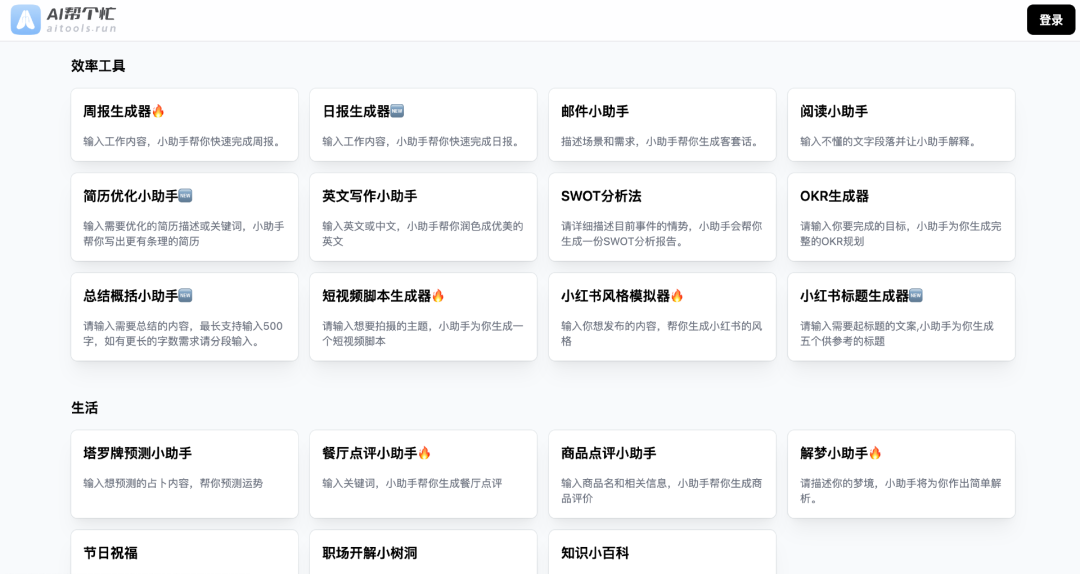 网站中的 AI 工具非常多,包括了周报生成器、邮件小助手、英文写作小助手、节日祝福、小红书风格模拟器等。