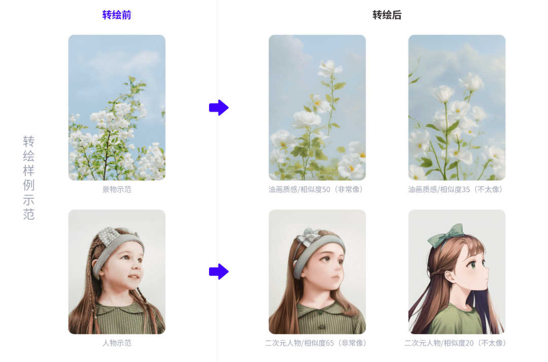 转绘产品是方便设计师寻找素材/灵感的图片转绘工具,使用流程很简单:【上传图片——选择模型——调整相似度】即可转绘出图,根据设计师的对出图的要求,可分为素材参考和灵感参考这两个用途,使用流程都一样,区别在于相似度的数值不同。