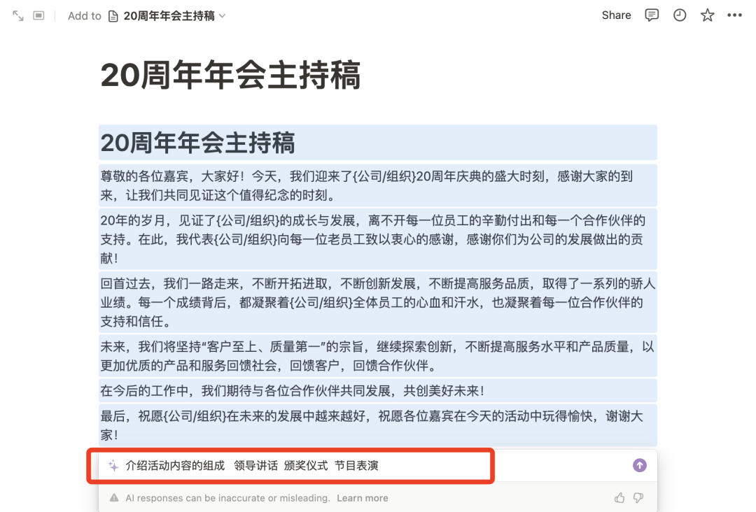 小知用它试写了一份20周年年会主持稿,很顺滑的生成一个文字模板。