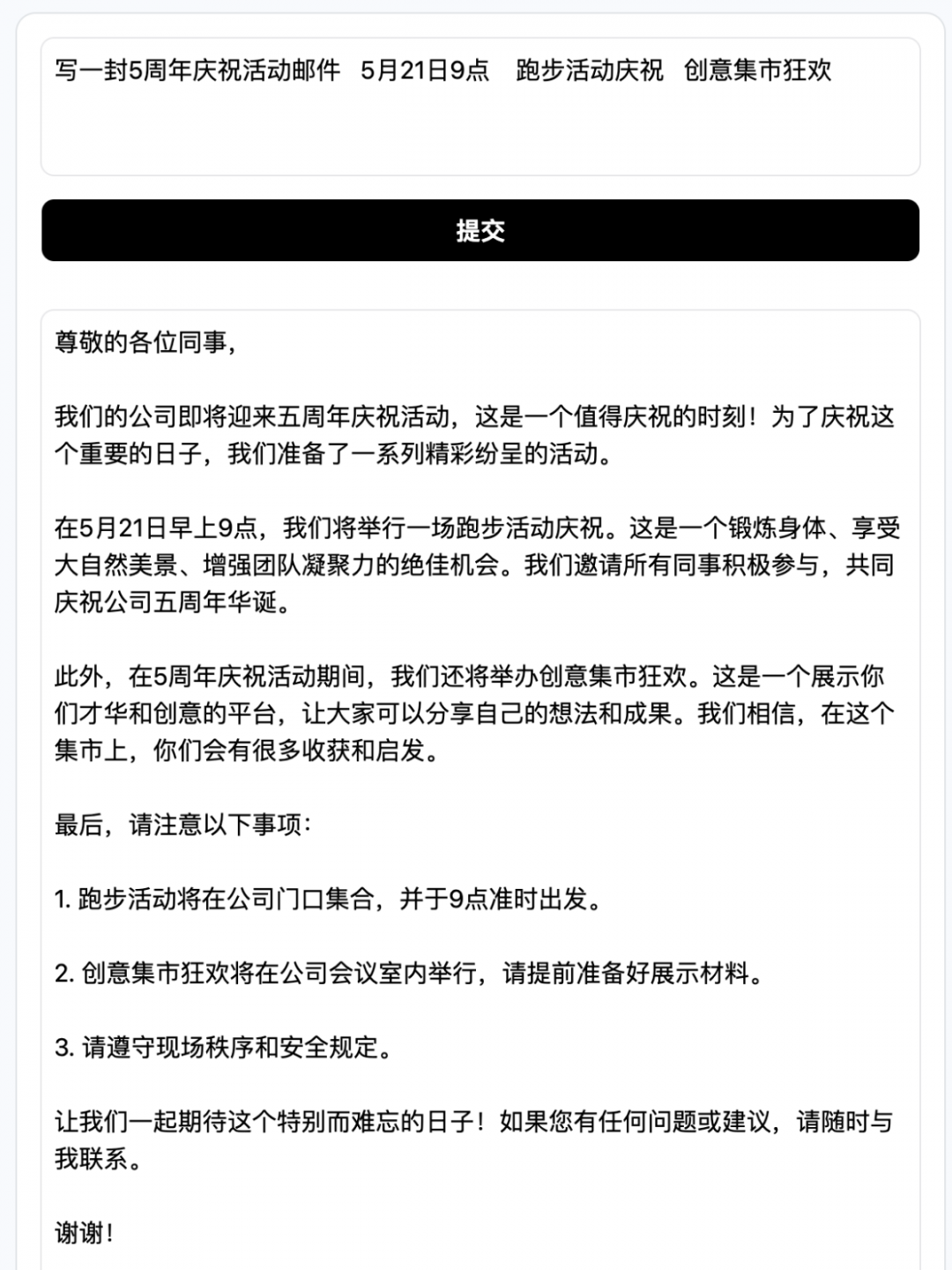 小知尝试用它写了一封周年庆祝活动通知邮件,它给出了两个版本,如果行文要求不是很严苛,后一版本就可以拿来进行稍微的修改和润色即可使用?。
