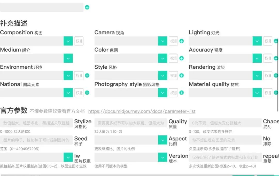 可以点击这些类别、设置参数,组合成想过的提示词,复制到Midjourney等绘图工具上使用。