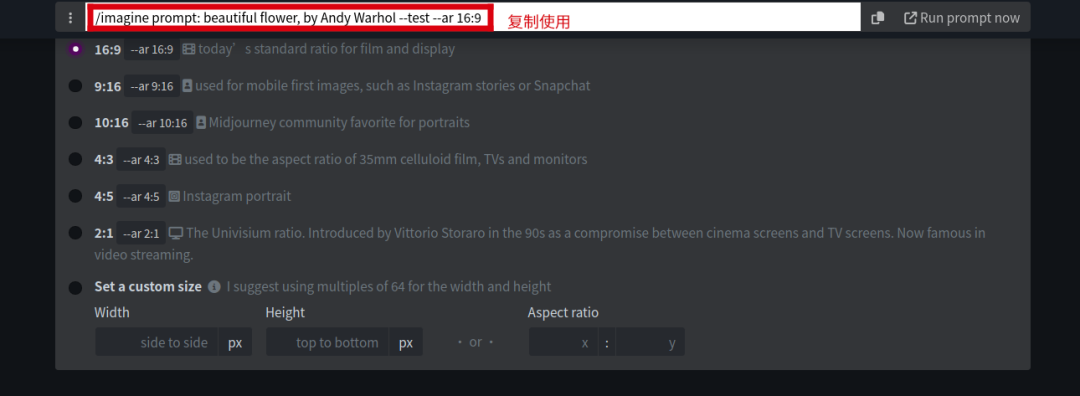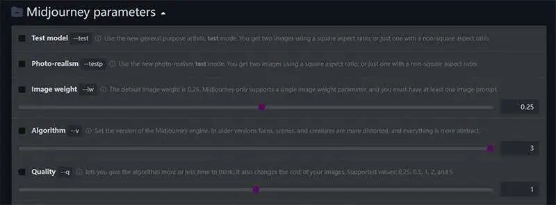 6、设置完成后,在顶部文本框可以看到我们前面设置的参数,关键词格式都按照Midjourney规范自动生成,您可以直接复制到Midjourney渲染。