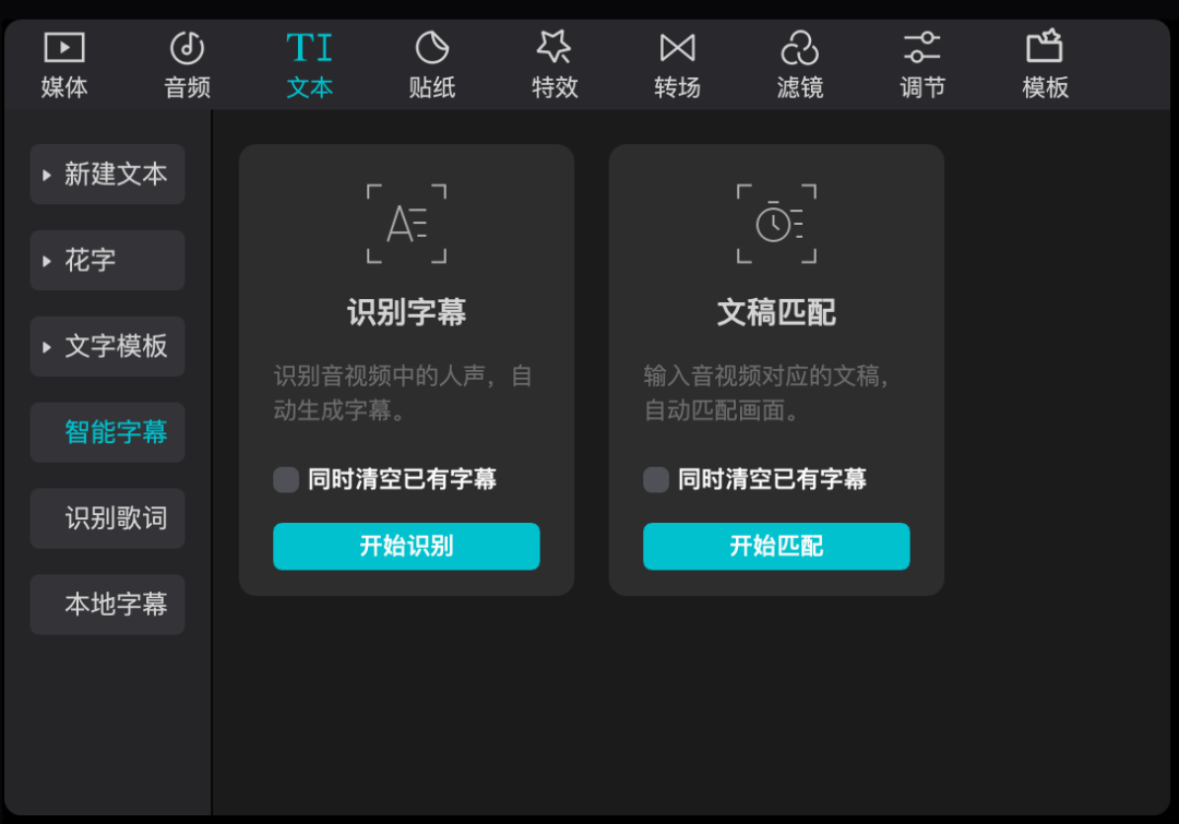 点击文本选项卡,再选择智能字幕功能,在识别字幕地方,点击开始识别,就正式进入语音转文字流程啦。