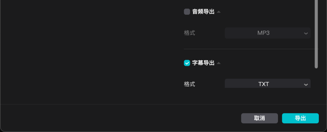 识别完成之后,点击右上角导出按钮,在弹出的对话框,我们去掉视频导出和音频导出选项卡,只保留字幕导出,格式可以选择文本或者字幕。