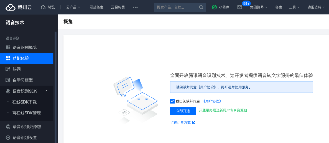 登录成功后,点击左上方的功能体验按钮。除此需要我们开通该服务,我们点击立即开通。