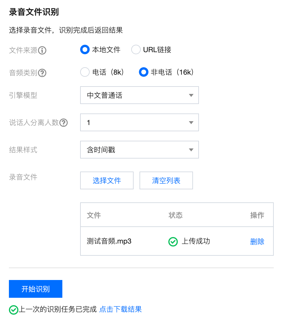 录音文件来源支持本地上传和URL链接,这一点比较方便。音频类别支持电话录音和非电话录音,这里需要正确选择,才能更好的识别语音文字。