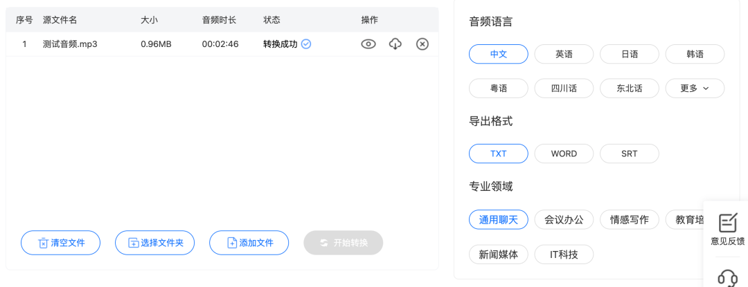 音频语言支持外语和方言,多达几十种,比上述两个工具都强大。导出格式支持TXT、Word和SRT,比较中规中矩。