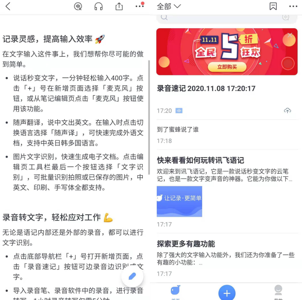 APP打开的页面是右边图片的样子,是以笔记的形式展示出来的,所有的语言最后都转换成了文字,大家看的时候就很方便,不需要像听语音一样从头到尾听。左边是讯飞语记的软件自述,大家可以看一下功能介绍。