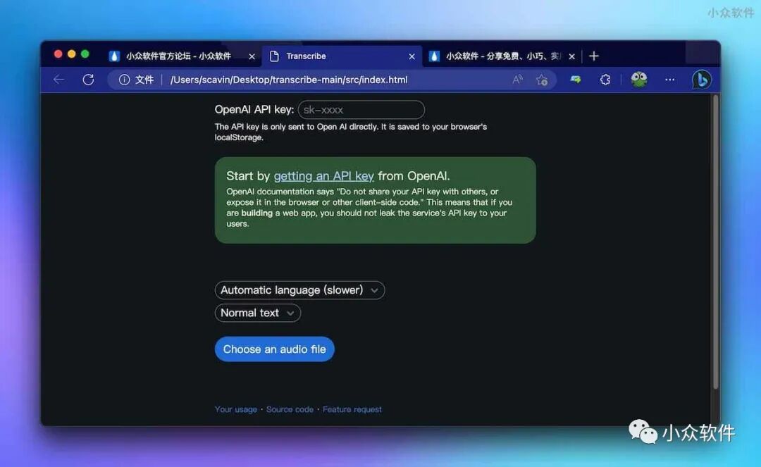 然后,在顶部输入你的 OpenAI API key(和 ChatGPT 同一个),就可以选择音频文件进行转换了,支持文本、.srt、.vtt 三种格式。