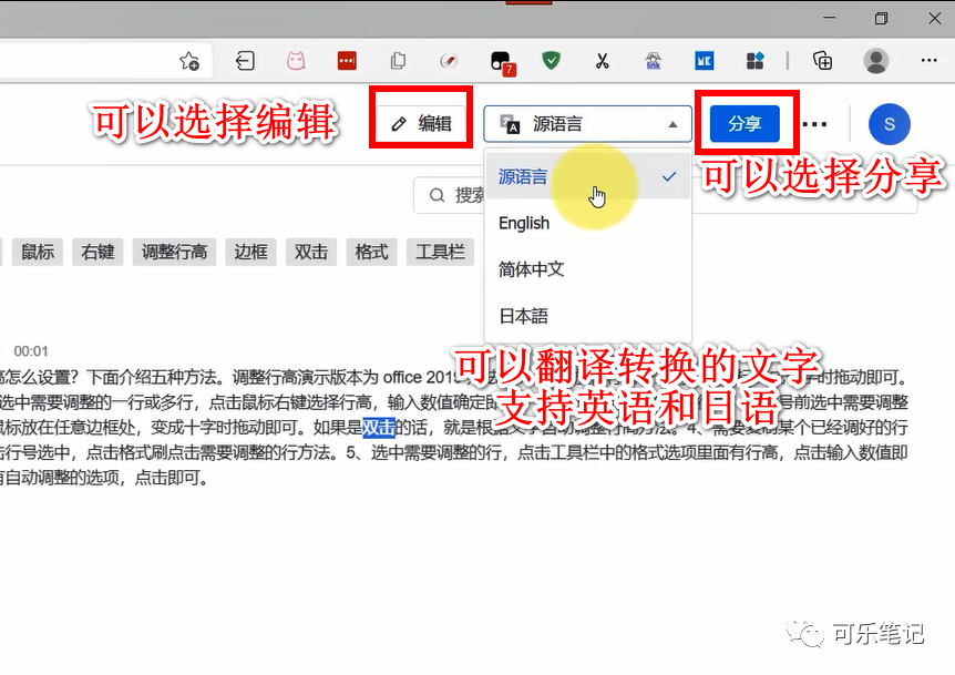 点击编辑可以更改文字,还可以翻译转换后的文件,有英语、中文、日语可供选择,点击分享可以分享给其他的人