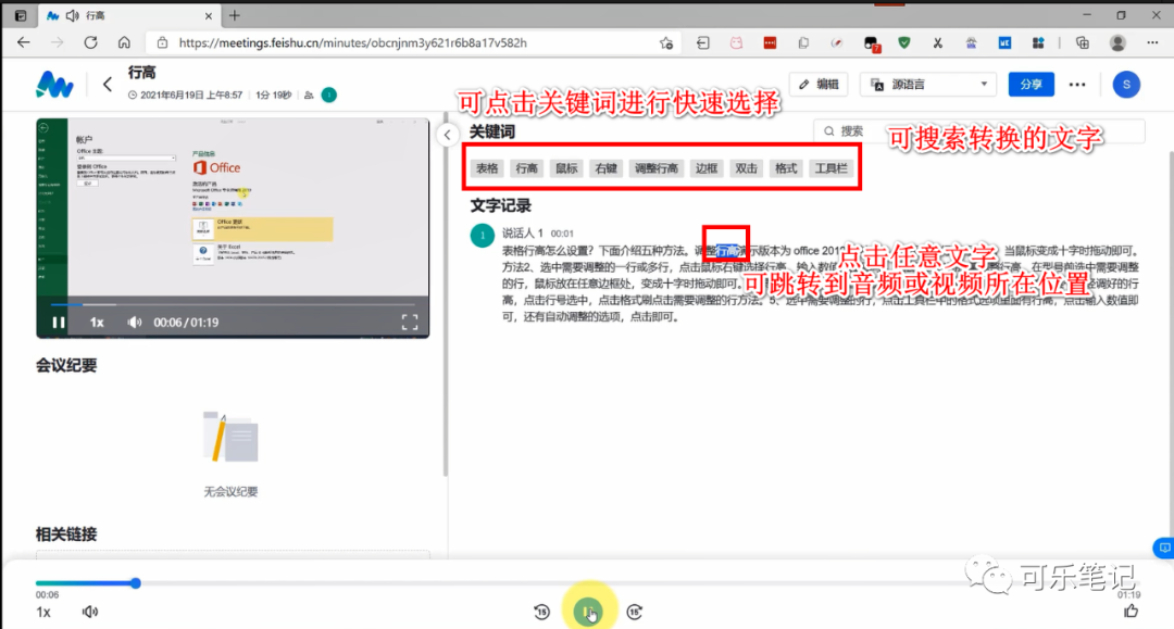 进入即可看到转换成功的文字,点击任意文字,可跳转到音频或视频对应播放的位置,也可点击上方提示的关键词进行快速选择