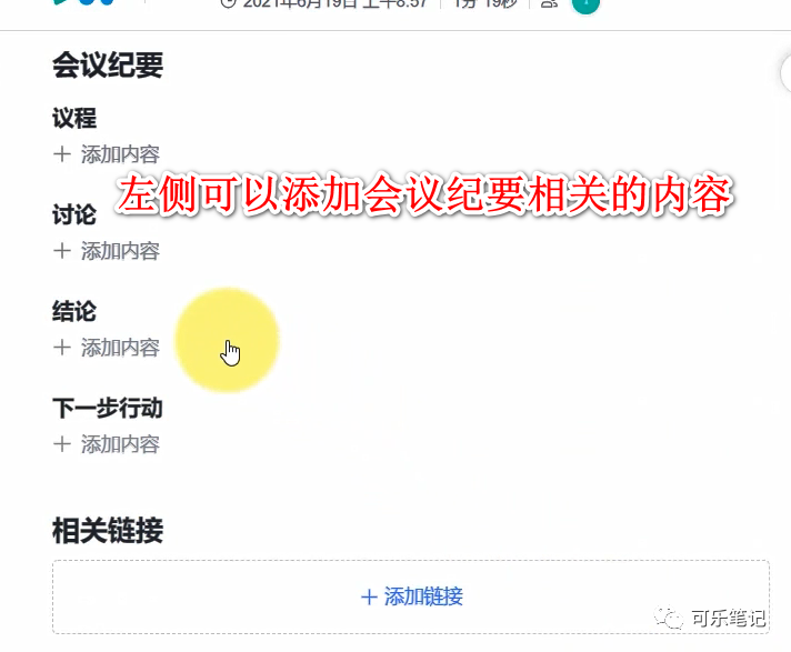 左侧,会议纪要处可以填写议程、讨论、结论、下一步行动等内容