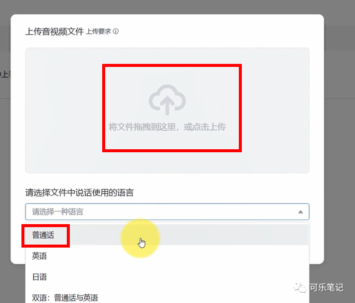 点击选择或拖拽要转换的音频文件,选择文件中使用的语言,有普通话、英语、日语、双语的选择,根据需要进行选择