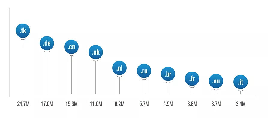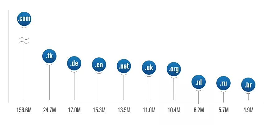 截至 2021 年 9 月 30 日,(报告数据显示)域名数量的最大前10位顶级域名为 .com、.tk、.de、.cn、.net、.uk、.org、.nl、.ru 和 .br。