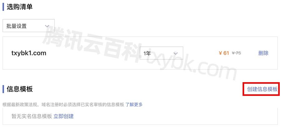 如果已经创建了实名信息模板,直接选择即可。如果当前腾讯云账号下没有域名信息模板,那么需要创建信息模板。