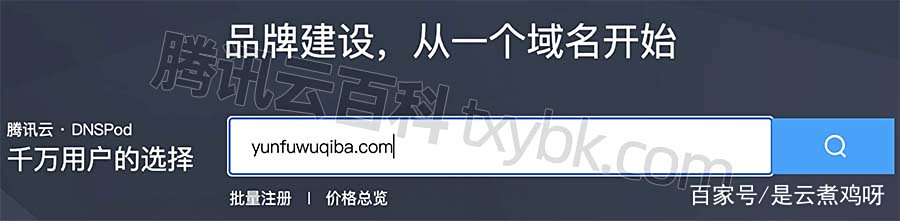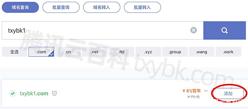 输入想要的域名,腾讯云百科以com域名为例,域名字符可以选择字母、数字和-,以腾讯云百科为例,在输入框中输入腾讯云百科的首字母txybk,然后点右侧的查询,如下图:
