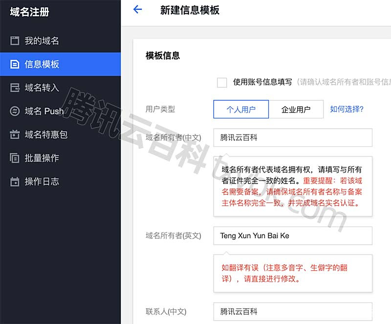 腾讯云域名创建实名信息模板
