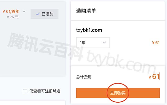 如上图,点右侧添加,将域名添加到选购清单中,然后点立即购买,如下图: