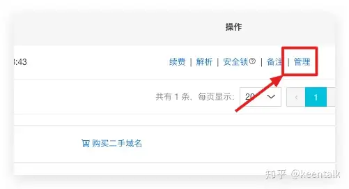 我们以阿里云域名举例,进入阿里云域名后台,点击域名的管理: