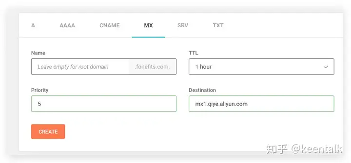 然后添加三个MX记录,Name处留空,Priority分别是5,10,15,Destination分别是http://mx1.qiye.aliyun.com/http://mx2.qiye.aliyun.com/http://mx3.qiye.aliyun.com